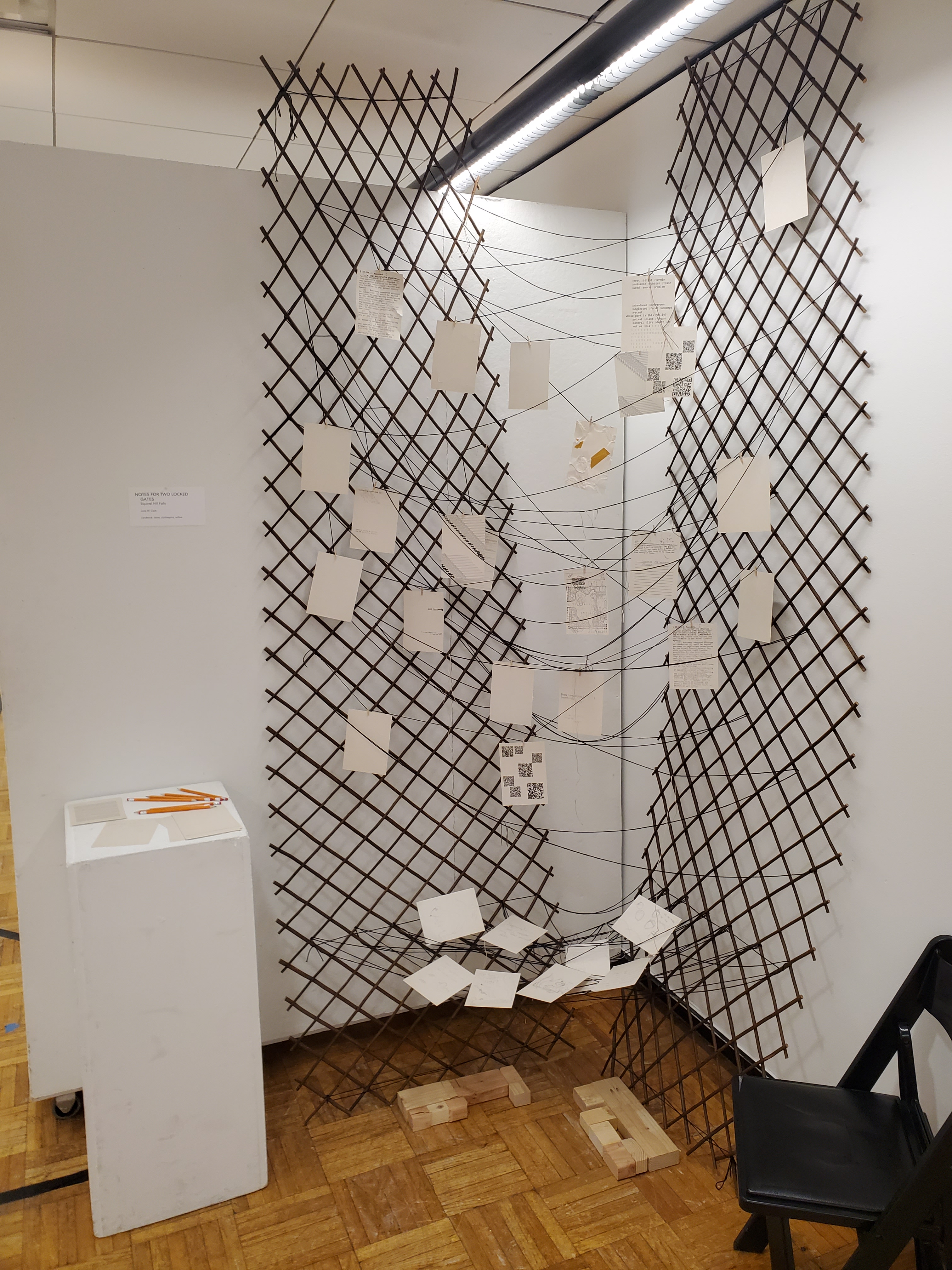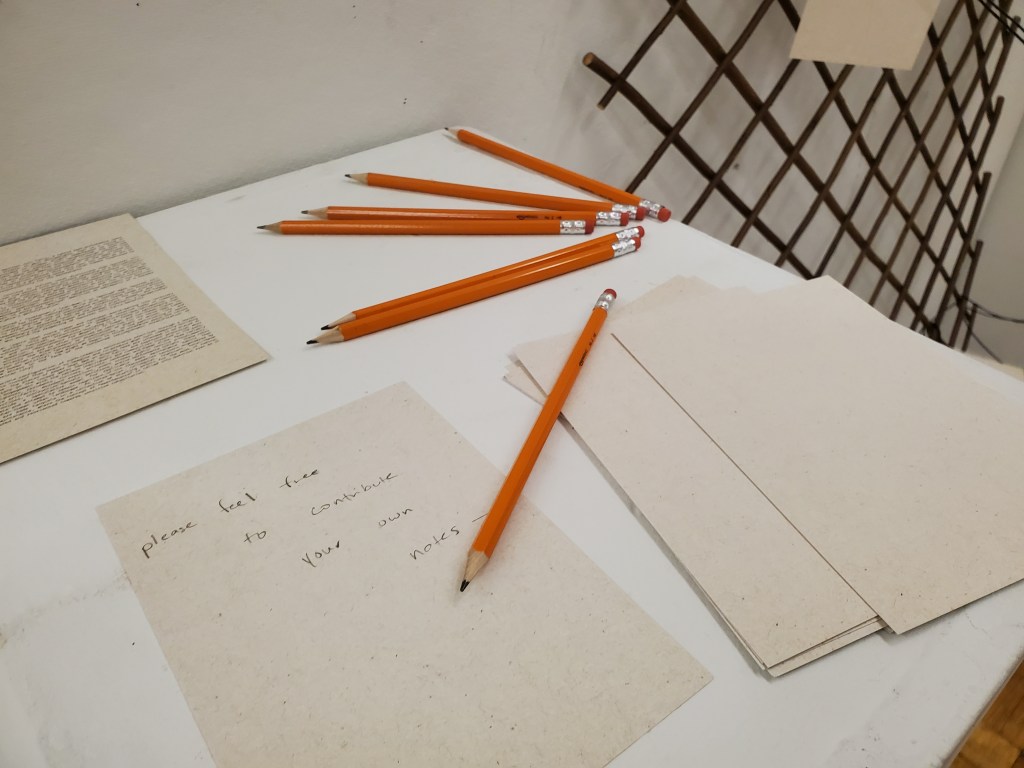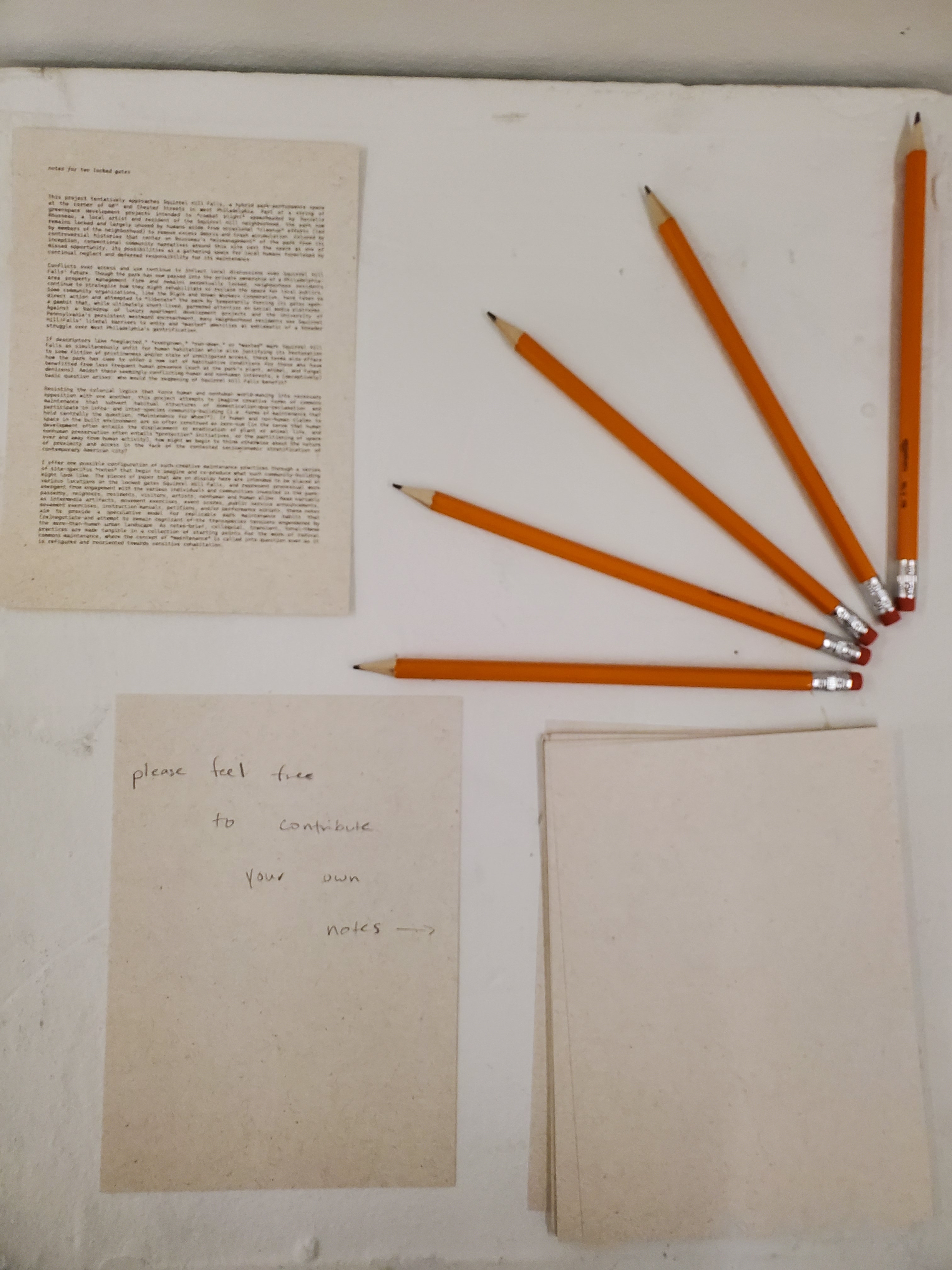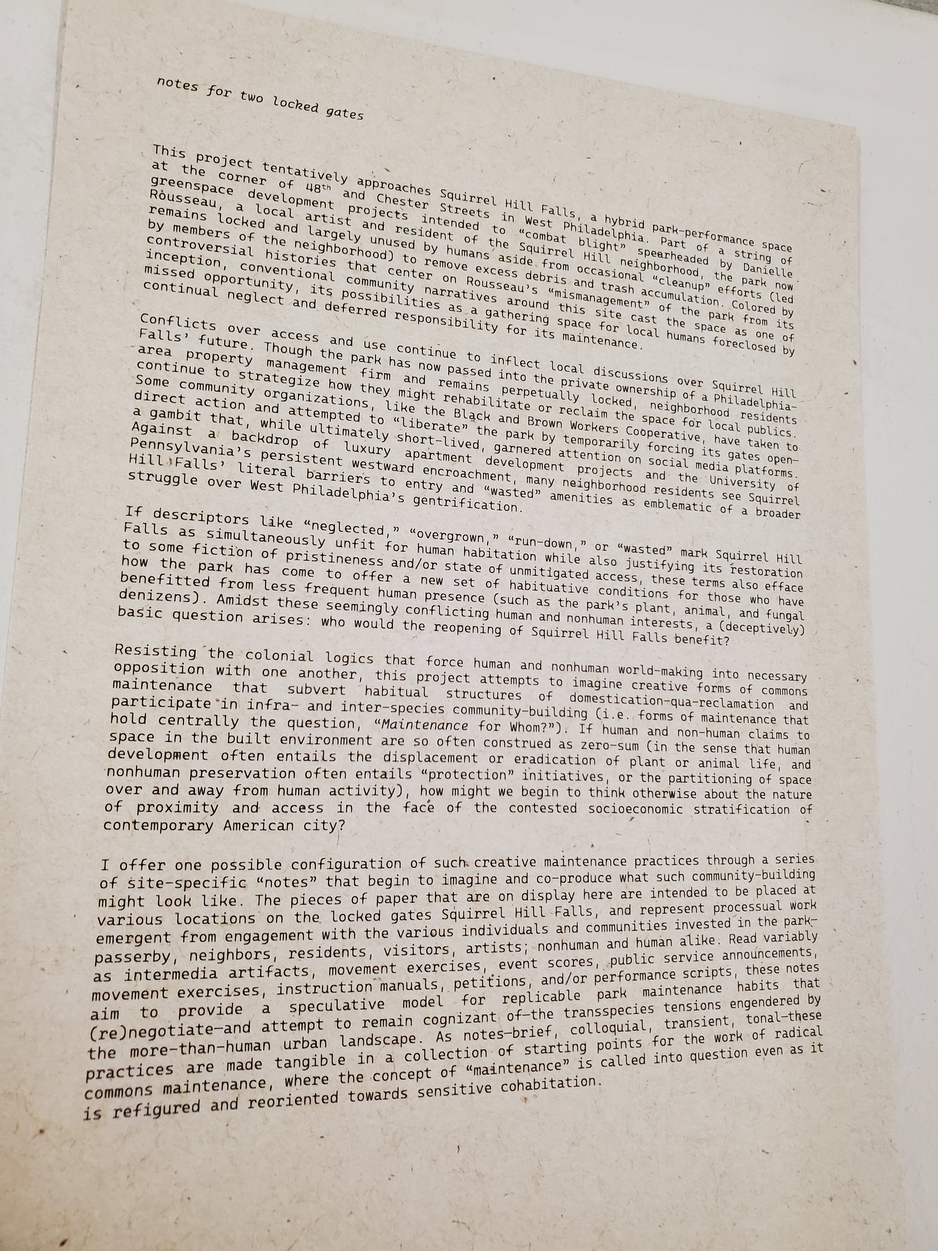 I offer one possible configuration of such creative maintenance practices through a series of site-specific “notes” that begin to imagine and co-produce what such community-building might look like. The pieces of paper that are on display here are intended to be placed at designated locations on the locked gates Squirrel Hill Falls, and represent processual work emergent from engagement with the myriad individuals and communities invested in the park—passerby, neighbors, residents, visitors, artists; nonhuman and human alike. Read variably as intermedia artifacts, movement exercises, event scores, public service announcements, instruction manuals, petitions, and/or performance scripts, these notes aim to provide a speculative model for replicable park maintenance habits that (re)negotiate—and attempt to remain cognizant of—the transspecies tensions engendered by the more-than-human urban landscape. As notes—brief, colloquial, transient, tonal—these practices are made tangible in a collection of starting points for the work of radical commons maintenance, where the concept of “maintenance” is called into question even as it is refigured and reoriented towards sensitive cohabitation.