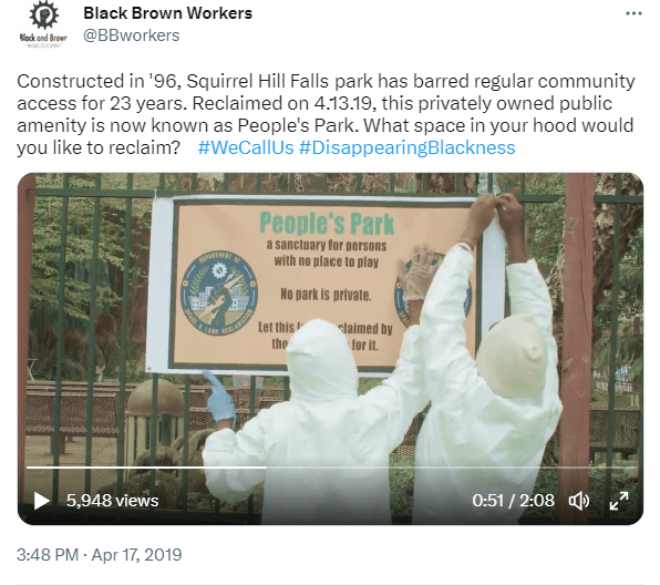 Conflicts over access and use continue to inflect local discussions over Squirrel Hill Falls’ future. Though the park has now passed into the private ownership of a Philadelphia-area property management firm and remains perpetually locked, neighborhood residents continue to strategize how they might rehabilitate or reclaim the space for local publics. Some community organizations, like the Black and Brown Workers Cooperative, have taken to direct action and attempted to “liberate” the park by temporarily forcing its gates open—a gambit that, while ultimately short-lived, garnered attention on social media platforms. Against a backdrop of luxury apartment development projects and the University of Pennsylvania’s persistent westward encroachment, many neighborhood residents see Squirrel Hill Falls’ literal barriers to entry and “wasted” amenities as emblematic of a broader struggle over West Philadelphia’s gentrification.